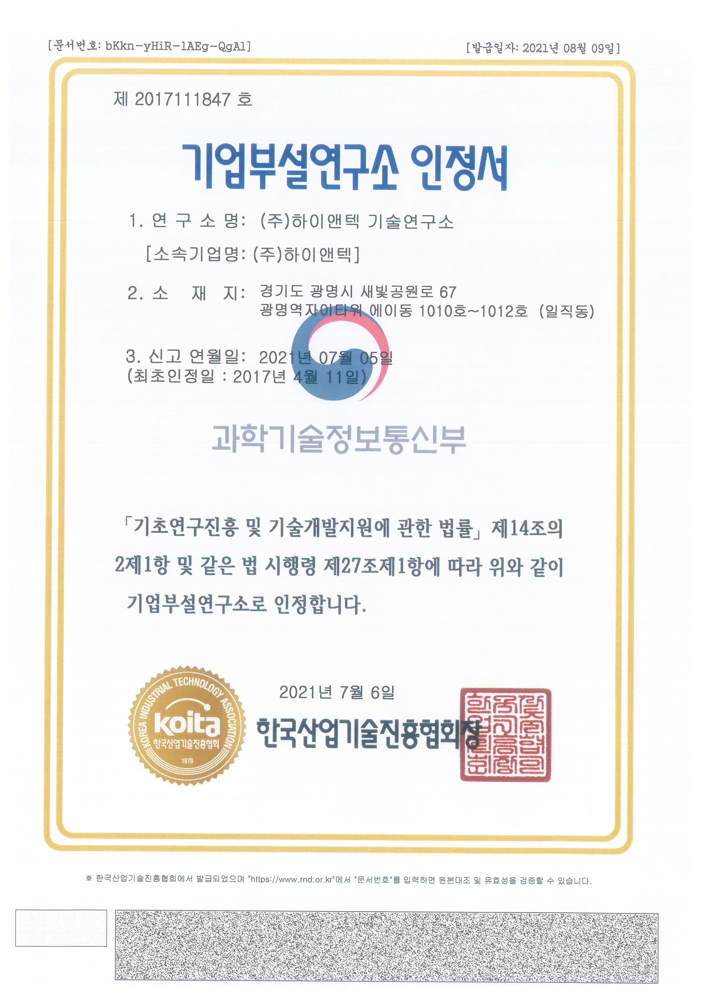 기업부설연구소 인증서