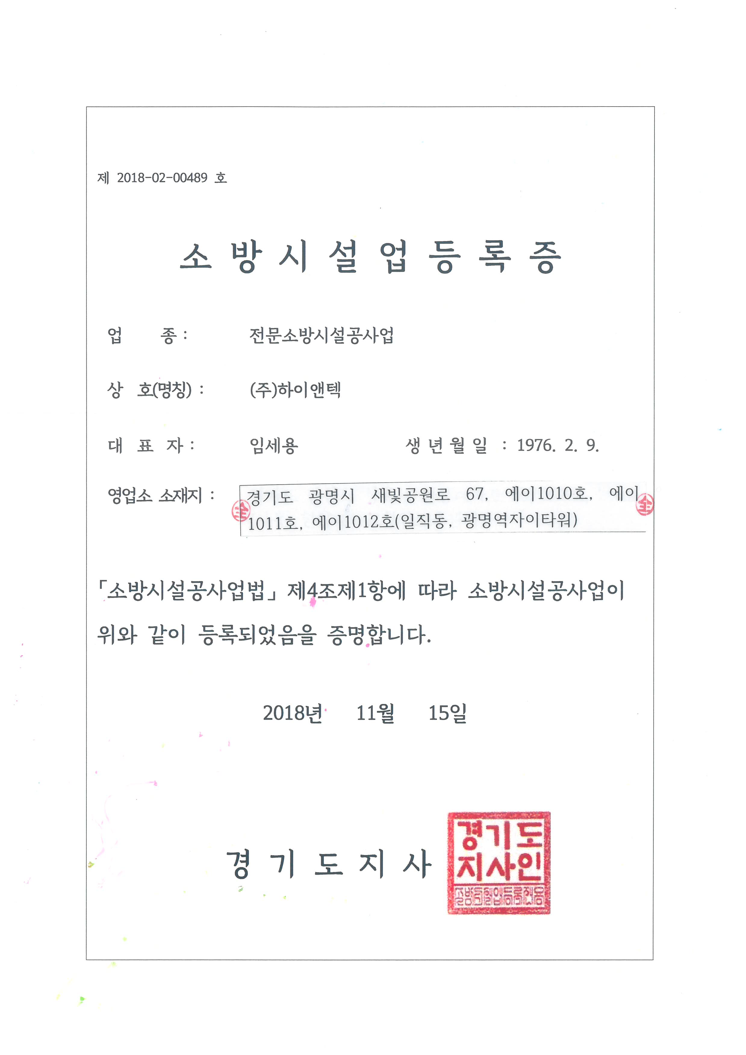 전문소방공사업 등록증