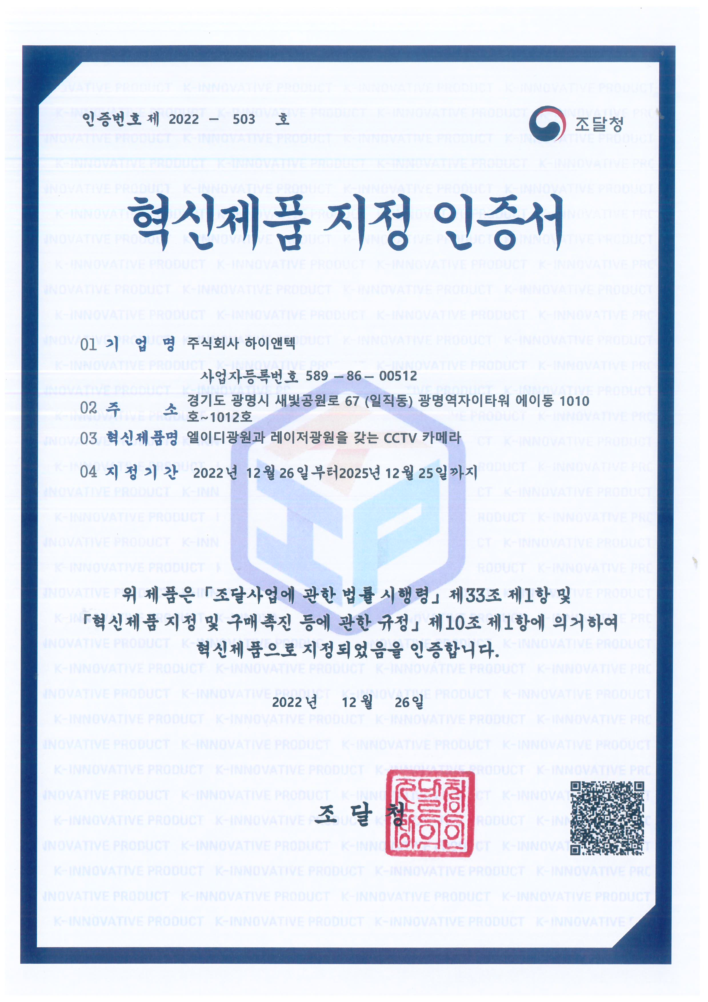 혁신제품 지정 인증서