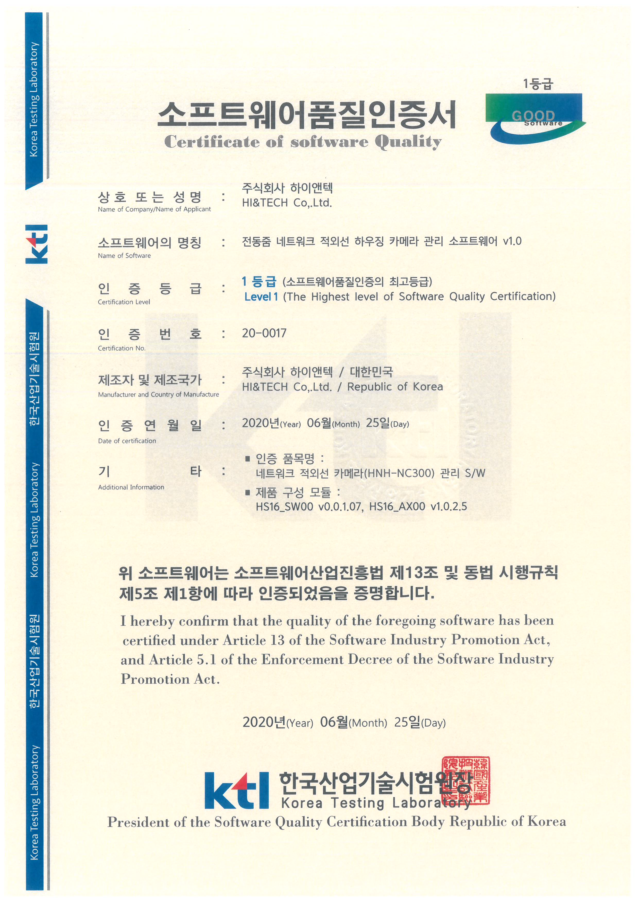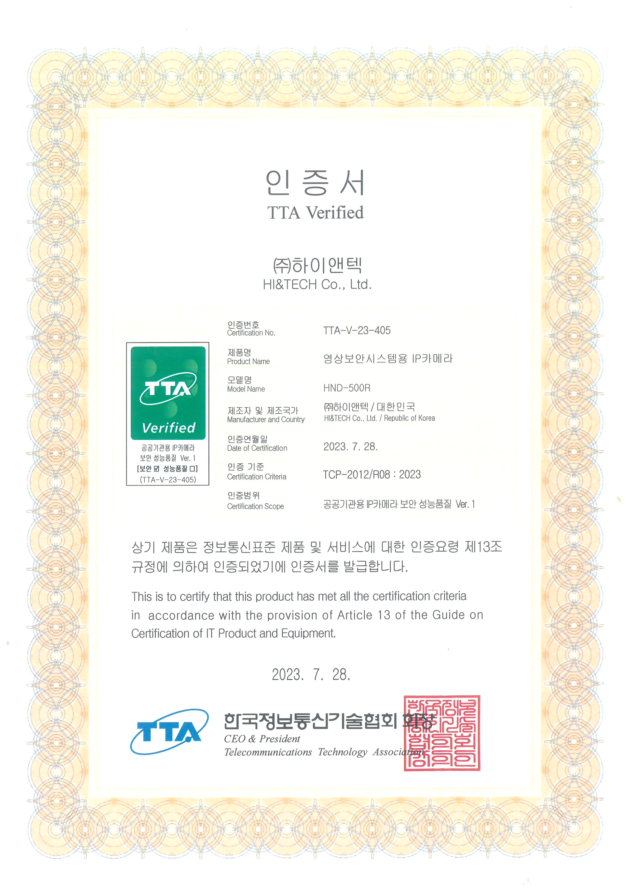 TTA 인증 - 영상보안시스템용 IP카메라